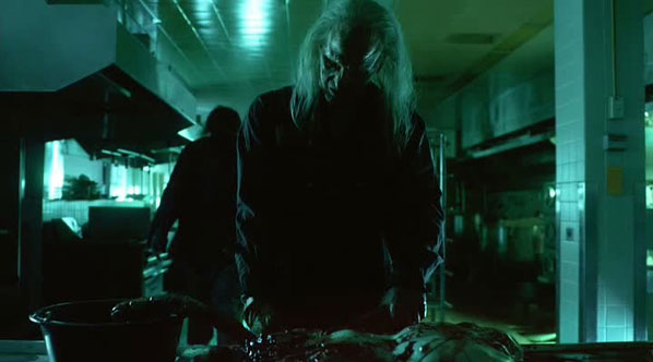 Car voyez-vous, Saw-Tooth, One-Eye et Three-Finger ont été retrouvés dans la forêt à côté des corps déchiquetés de leurs parents – qu’ils avaient vraisemblablement grignotés comme des petits gâteaux secs. Ils ont été récupérés et placés dans un hôpital psychiatrique, dans lequel on a découvert qu’en plus d’être trois petits cannibales dégueulasses, ils ne ressentent pas la douleur. Alors du coup je me suis demandé si c’était cohérent avec les trois précédents Wrong Turn et j’ai pas réussi à me souvenir si ils semblaient souffrir des attaques de leurs futures victimes. Faudra que je vérifie (en attendant, si quelqu’un a la réponse, qu’il se fasse entendre). Bref, vu qu’ils ne ressentent pas la douleur et qu’il sont un peu crétins (à force de niquer entre eux, ça finit par endommager sérieusement leurs capacités intellectuelles), ils s’amusent à s’auto-mutiler. On connait donc l’origine de leurs « infirmités » : Three-Finger s’est mangé les deux doigts d’une main un jour où il se faisait un peu chier, One-Eye s’est éborgné avec une fourchette pour faire son intéressant à la cantine et Saw-Tooth s’amuse à s’aiguiser les dents sur un mur pour les tailler en pointe. Voilà voilà, des petits garnements tout à fait sains de corps et d’esprit donc. Ils finissent par se libérer, foutent un bordel monstre dans l’hôpital en libérant les autres patients et en tuant tout le personnel, le tout au ralenti sur Le Beau Danube Bleu. C’est beaauuu.